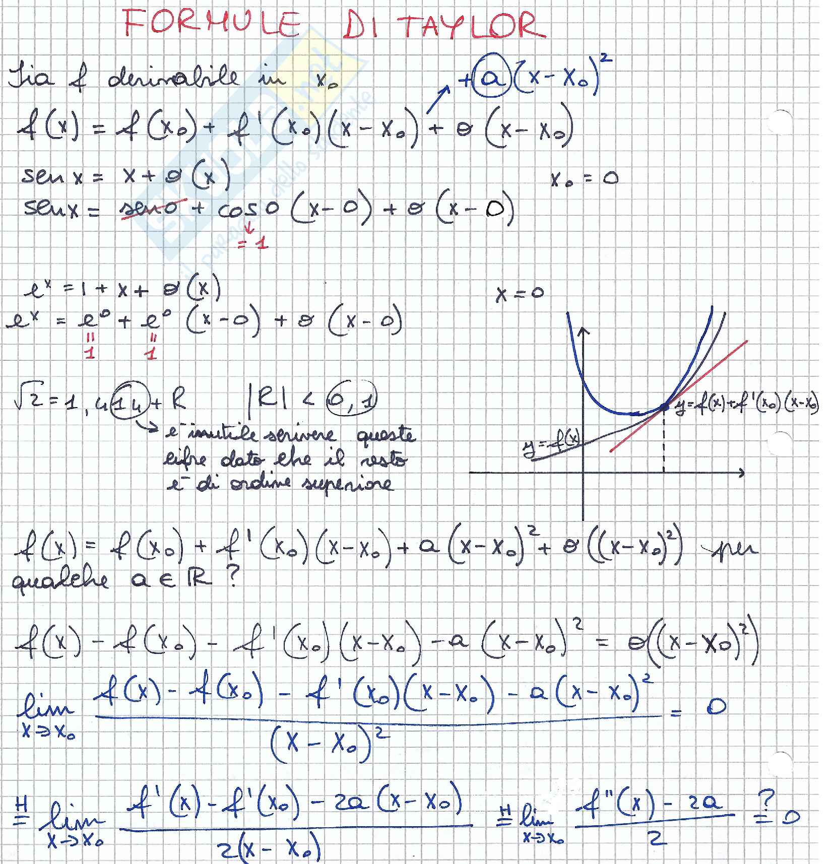Teorema (formula di taylor locale, con il resto di peano) in particolare, se x0 = 0, si ha la formula (detta di maclaurin) teorema (formula di taylor con il resto di lagrange). Il teorema di taylor, in analisi matematica, è un teorema che fornisce una sequenza di approssimazioni di una funzione differenziabile attorno ad un dato punto mediante i polinomi di taylor, i cui coefficienti dipendono solo dalle derivate della funzione nel punto. Il resto di peano una funzione f definita in un intorno di un punto x0 si dice derivabile in x0 se e solo se. Formula di taylor resto di lagrange e resto di peano 70. Dierenza tra la funzione f (x) e il teorema 1.2 (formula di taylor con il resto di peano) sia f una funzione di classe cn su un intervallo aperto i dell'asse reale.