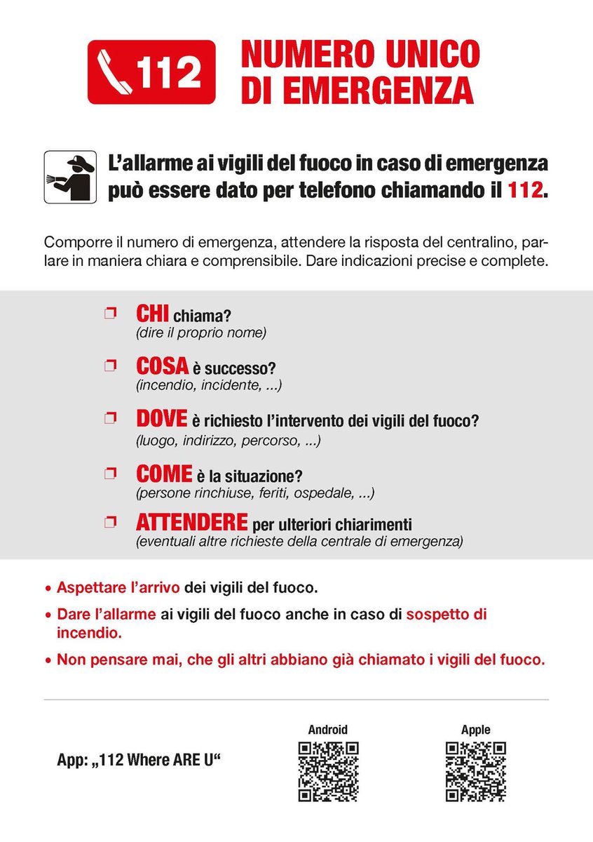 Qualunque numero nazionale di emergenza si chiami (113, 112, 115 e 118), la telefonata viene ricevuta dalla centrale unica di risposta. I vigili del fuoco sono stati subito soccorsi dai colleghi presenti sull'altro mezzo e poi dal 118 immediatamente allertato. Dipartimento dei vigili del fuoco del soccorso pubblico e della difesa civile.