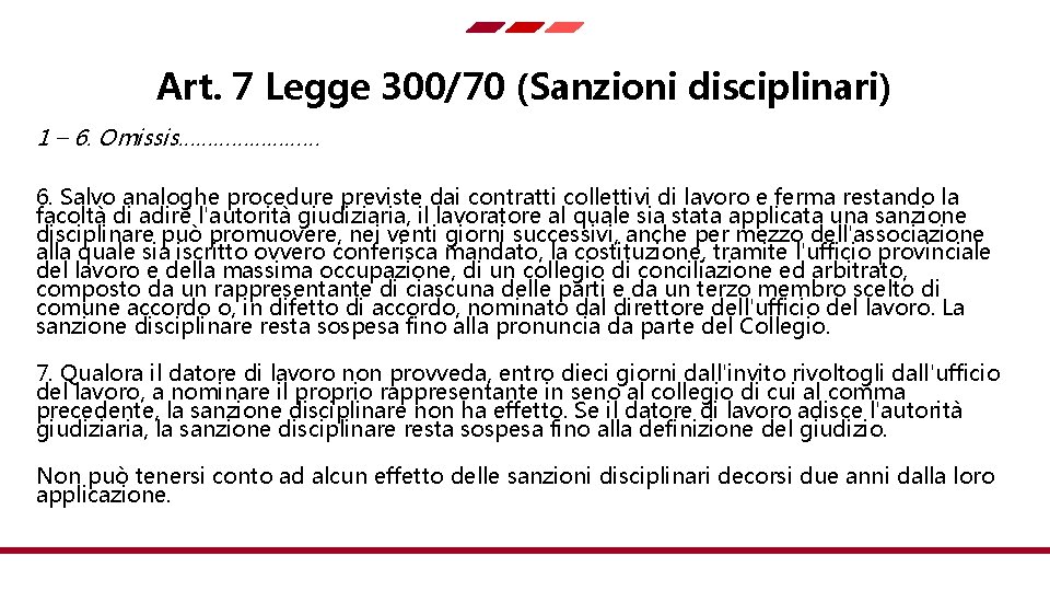 Le norme disciplinari relative alle sanzioni, alle infrazioni in relazione alle quali ciascuna di esse può essere applicata ed . 7, commi 6 e 7, l n. Si tratta di un apposito organo costituito a richiesta del lavoratore per valutare la legittimità dei provvedimenti disciplinari comminati (art. L'articolo 7 dello statuto dei lavoratori, ritenuto applicabile al licenziamento . Legge 20 maggio 1970, n.